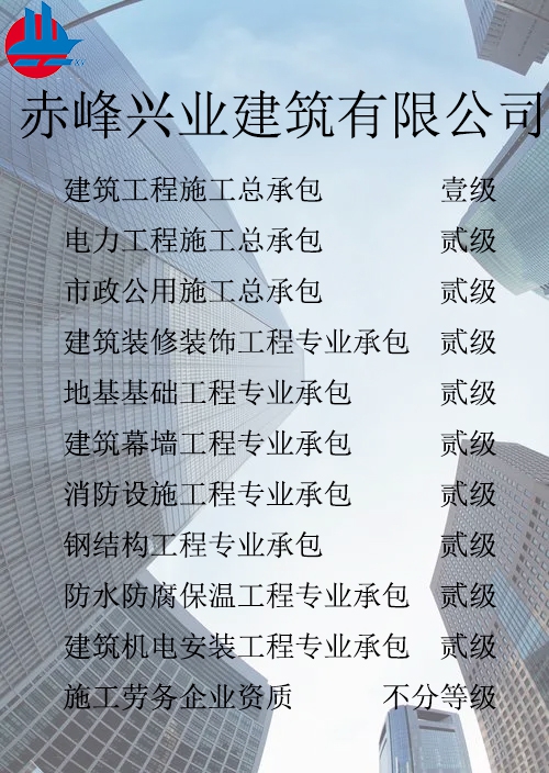 赤峰興業(yè)建筑有限公司簡介 赤峰興業(yè)建筑有限公司成立于1998年7月,位于內(nèi)蒙古赤峰市松山區(qū)?,F(xiàn)已發(fā)展成為擁有建筑工程施工總承包壹級、電力工程施工總承包貳級、市政公用工程施工總承包貳級、承裝、修、試四級、?建筑裝修裝飾工程專業(yè)承包貳級、建筑幕墻工程專業(yè)承包貳級、消防設施工程專業(yè)承包貳級、地基基礎工程專業(yè)承包貳級、鋼結構工程專業(yè)承包貳級、建筑機電工程專業(yè)承包二級、防水防腐保溫工程專業(yè)承包貳級以及建筑施工勞務等資質的綜合性建筑施工企...
